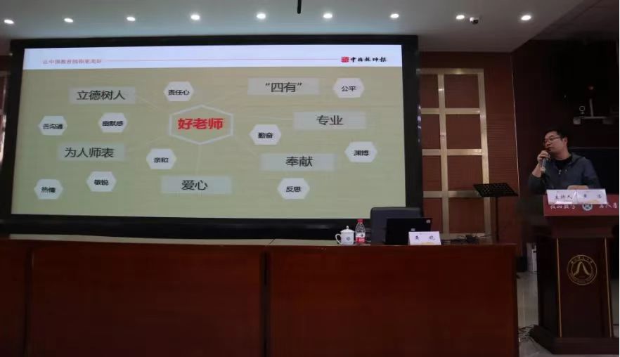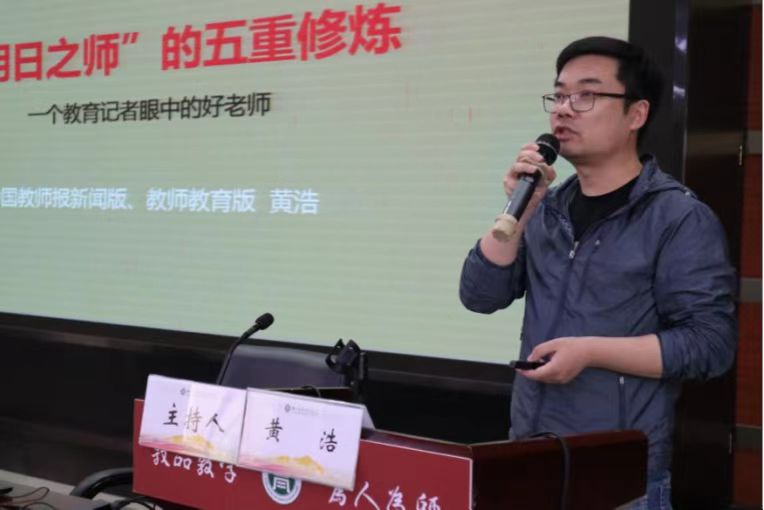 教师是需要终身学习的职业,如何成为一位好老师是每一位教师的终身课题。4月16日下午,教育学院敦品讲坛第一讲邀请了中国教师报新闻版主编、教师教育版主编,新媒体负责人黄浩主编,于17幢112报告厅为我院师生进行了题为““明日之师'的五重修炼——一个教育记者眼中的好老师的精彩讲座。本次讲座由学院院长黄晓教授主持,100余名师生到场聆听。