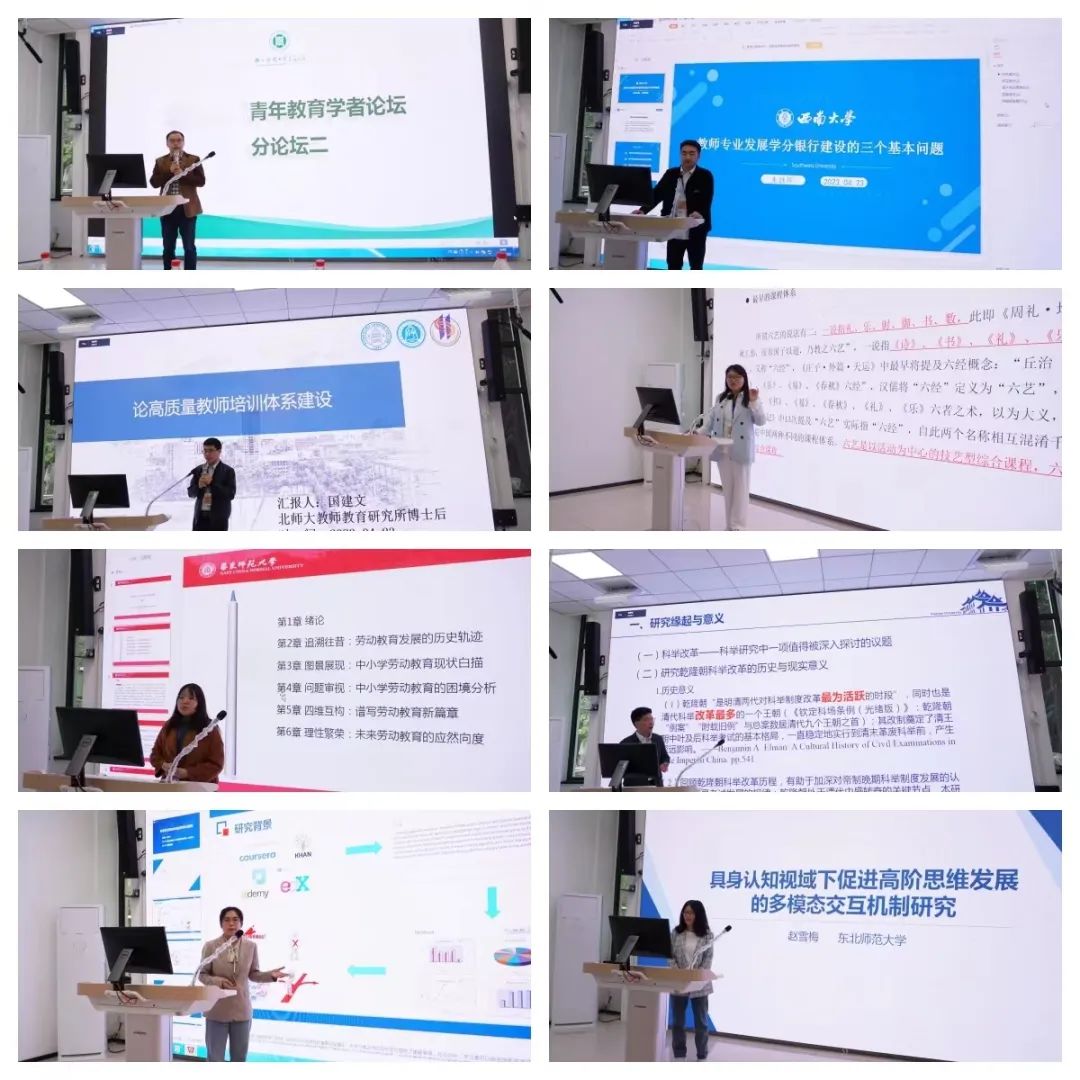 中央民族大学国建文、厦门大学毛鹏程、华东师范大学阴崔雪、华东师范大学孙会平、华中师范大学康令云、东北师范大学赵雪梅和西南大学朱胜晖等七位博士分别就《论高质量教师培训体系建设》《清乾隆朝科举改革研究》《中国最早的课程:六艺的起源与发展研究》《理性繁荣:中小学劳动教育的省思和重构》《协作讨论活动中的分析技术研究》《具身认知领域下促进高阶思维发展的多模态交互机制研究》和《教师专业发展学分银行建设的三个基本问题》进行了精彩分享。与会专家、参会研究生与7位博士进行了友好的学术交流。