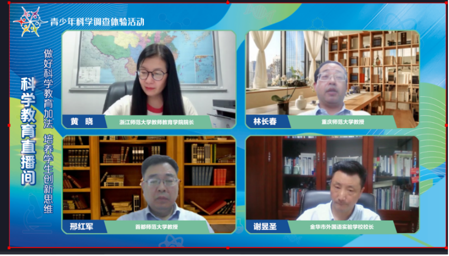 近日,黄晓教授应邀请主持科学教育直播间“做好科学教育加法,培养学生创新思维”主题活动。本次活动由重庆师范大学初等教育学院教授、中国青少年科技教育工作者协会科学教师教育专委会理事长林长春教授,首都师范大学教育学院博士生导师邢红军教授、金华市外国语实验学校校长谢昱圣特级教师共同参与。