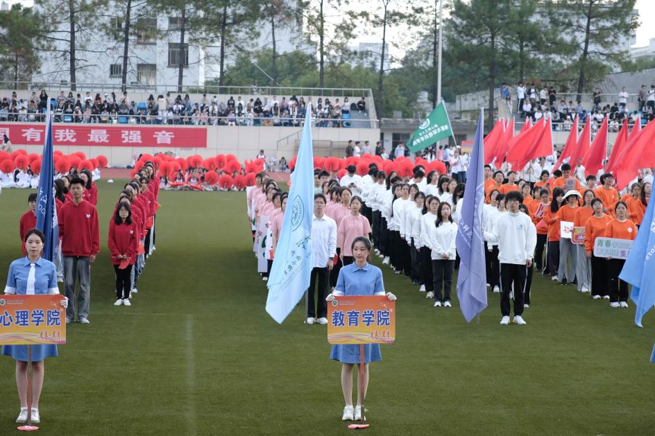 教育学院方阵入场,落落大方,精神抖擞。党委副书记王玉琴,团委书记兼学工办主任叶青,辅导员刘颖、冯奕程、唐舟赢、胥松澔走在队伍的前方,他们步伐坚定,笑容满面,展现了对健儿们的衷心鼓舞。运动员代表们高擎院旗,高举院训,斗争昂扬的口号彰显教育学子积极拼搏,奋勇直前的壮志豪情。