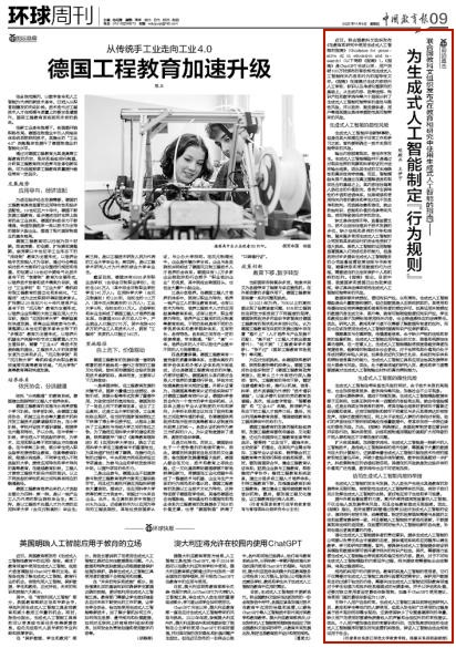 日前,浙江师范大学教育学院陈殿兵副教授、硕士研究生王伊宁在《中国教育报》刊发署名文章《为生成式人工智能制定行为规则》。文章在解读联合国教科文组织发布的《在教育和研究中使用生成式人工智能的指南》的基础上,从生成内容、政策法规、知识产权和数字鸿沟等六个层面分析了生成式人工智能可能带来的显性与隐性风险,并从政府、服务提供者、用户等层面提出具体举措防范其可能带来的风险。