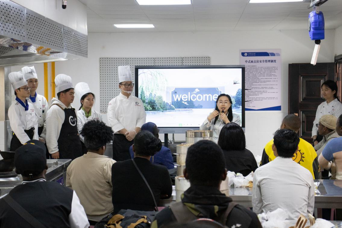 随后,讲解员带领留学生们来到中式面点实训室。为了增加互动性和趣味性,讲解员以有奖问答的形式向大家介绍了清明节的由来和习俗。