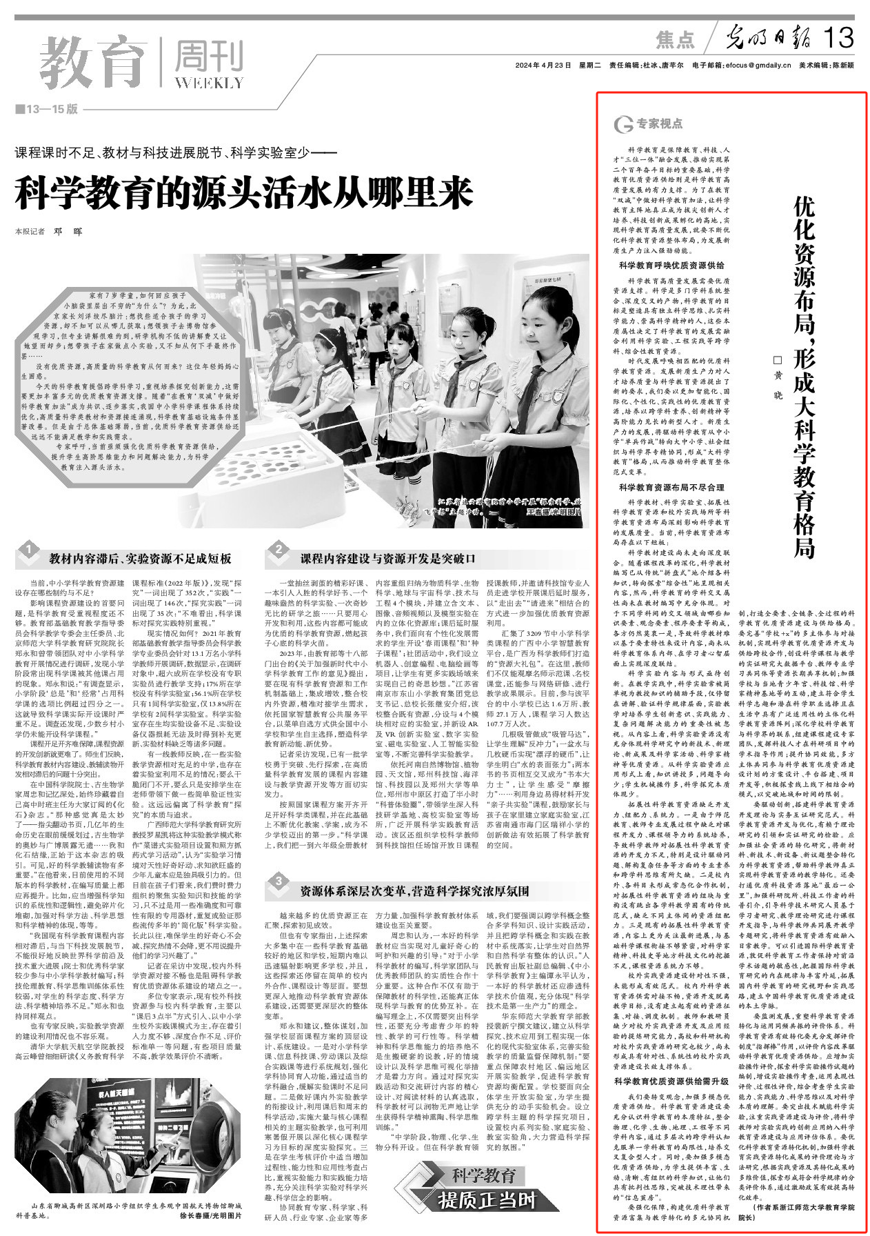 文章进一步指出,科学教育资源布局不尽合理。科学教材、科学实验室、拓展性科学教育资源和校外实践场所等科学教育资源布局深刻影响科学教育的发展质量。当前,科学教育资源布局存在以下短板:科学教材建设尚未走向深度联合;科学实验内容与形式亟待创新;拓展性科学教育资源缺乏开发力、组配力、系统力;校外实践资源建设针对性不强,未能形成有效范式。