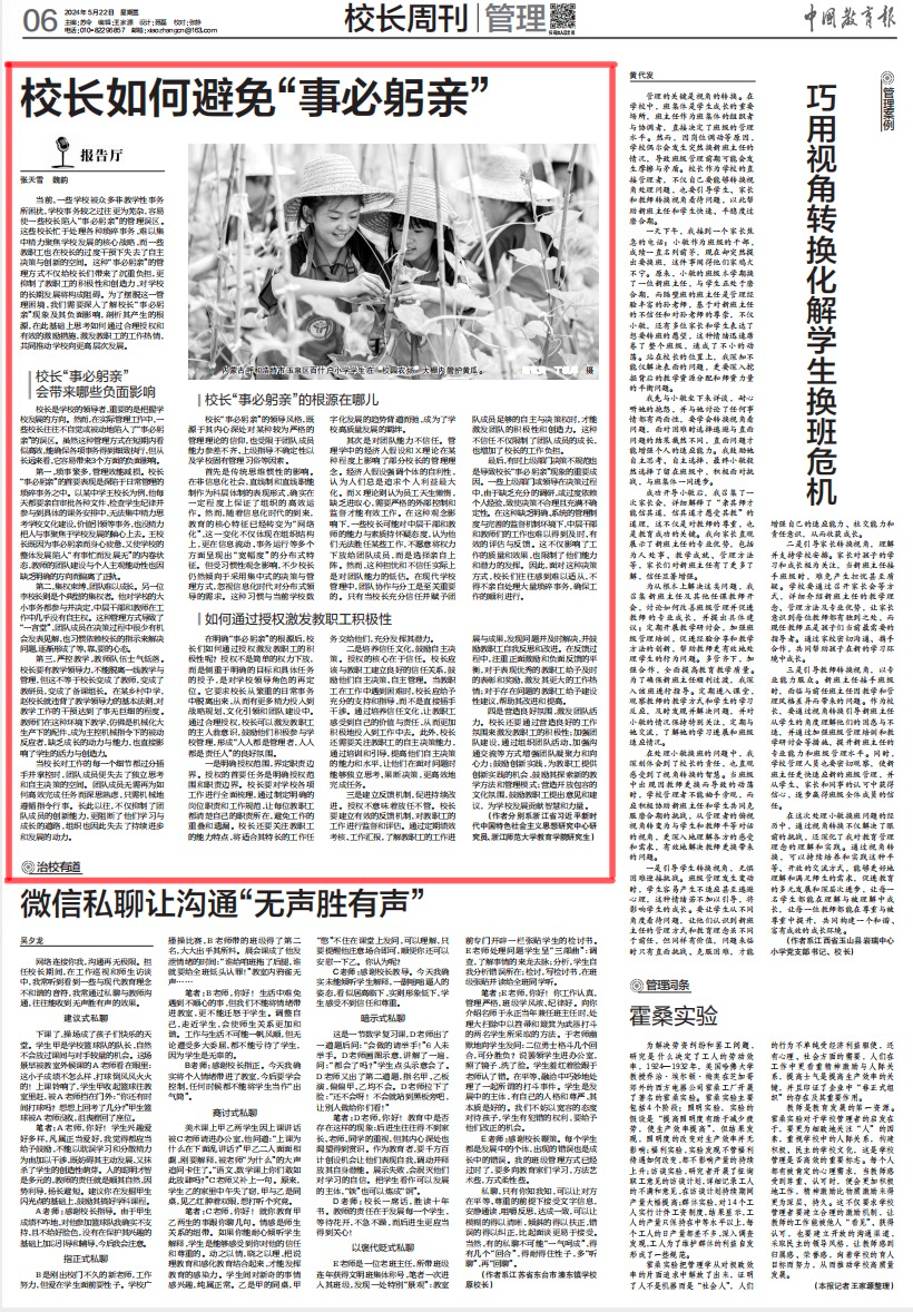 近日,浙师大教育改革与发展研究院常务副院长张天雪教授与其硕士研究生魏韵在《中国教育报》刊发署名文章《校长管理如何避免“事必躬亲”》。文章首先以案例形式指出当前学校管理陷入“事必躬亲”的困境表象,再从“传统思维惯性、团队能力信任度、上级决策规范性”三方面分析校长“事必躬亲”的根源在哪儿,最后从如何通过授权激发教职工积极性角度出发,通过明确授权范围、培养信任文化、建立反馈机制、营造良好氛围四方面激发教职工的主人翁意识,鼓励他们积极参与学校管理,形成“人人都是管理者,人人都是责任人”的良好氛围。