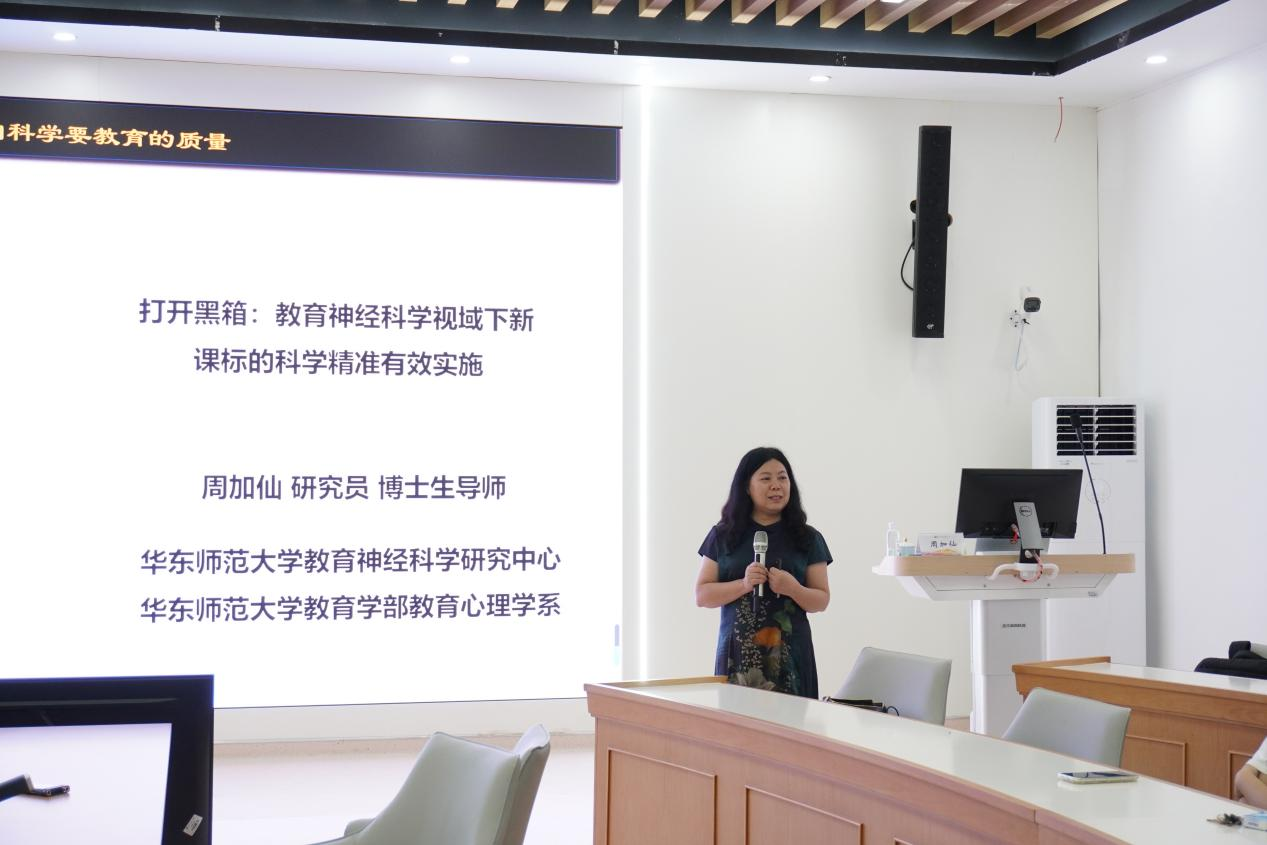 6月19日,华东师范大学教育学部研究员、教育神经科学研究中心副主任周加仙教授应邀做题为“打开黑箱:教育神经科学视域下新课标的科学精准有效实施”的学术讲座。40余位师生参加讲座,教育学院副院长王良辉教授主持本次讲座。