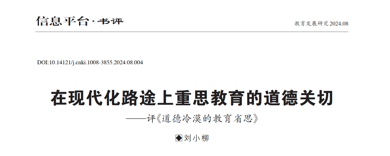 近日,教育学院刘小柳老师在《教育发展研究》2024年第8期上发表题为“在现代化路途上重思教育的道德关切——评《道德冷漠的教育省思》”的研究论文。文章以国内道德教育研究专家高德胜教授2023年9月出版的《道德冷漠的教育省思》一书为出发点,立足于当前教育现代化背景,以重新审视和阐明教育对社会的道德关切。