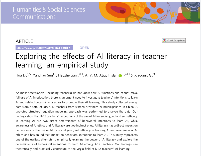 近日,浙师大教育学院杜华、孙艳超两位副教授在《Humanities & Social Sciences communications》上发表题为《探究人工智能素养在教师学习中的影响:一项实证研究》(Exploring the effects of AI literacy in teacher learning: an empirical study)的学术论文。