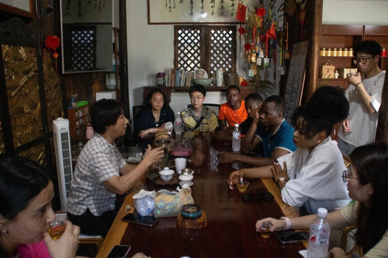 午后,中外学生到金华酸茶馆喝茶,体验非物质文化遗产。品尝后大家发现,茶并不是酸的,而且喝起来很清新。通过传承人的讲解,大家了解到酸茶之酸来源于毛竹筒中发酵的酸味。