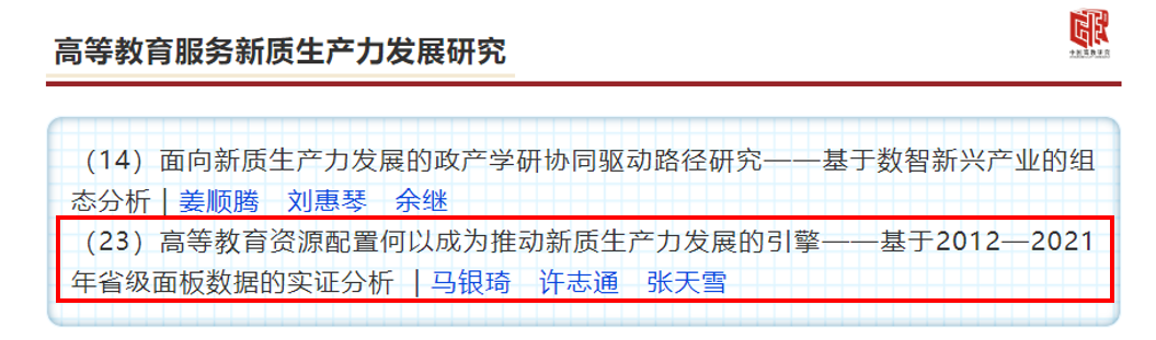 近日,浙江师范大学教育学院青年教师马银琦、硕士研究生许志通以及张天雪教授在CSSCI来源期刊《中国高教研究》2024年第8期发表《高等教育资源配置何以成为推动新质生产力发展的引擎——基于2012-2021年省级面板数据的实证分析》。2023年9月,习近平总书记在黑龙江省考察期间提出“加快形成新质生产力,增强发展新动能”,其后2024年政府工作报告及党的二十届三中全会中均强调了发展新质生产力对促进我国经济高质量发展、实现中国式现代化的重要意义。在此背景下,文章基于2012—2021年中国30个省份的面板数据,实证检验高等教育资源配置影响新质生产力发展的逻辑机理,为科学配置高等教育资源、提升新质生产力发展水平提供参考依据和政策指引。