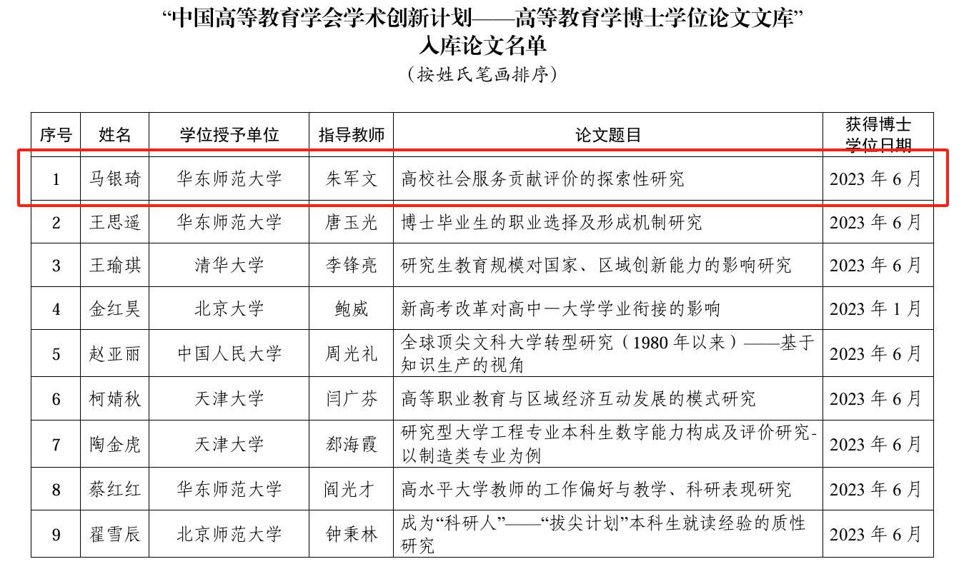 中国高等教育学会于2024年8月28日公布“中国高等教育学会学术创新计划——高等教育学博士学位论文文库”入库名单,我院青年教师马银琦博士学位论文《高校社会服务贡献评价的探索性研究》入选。
