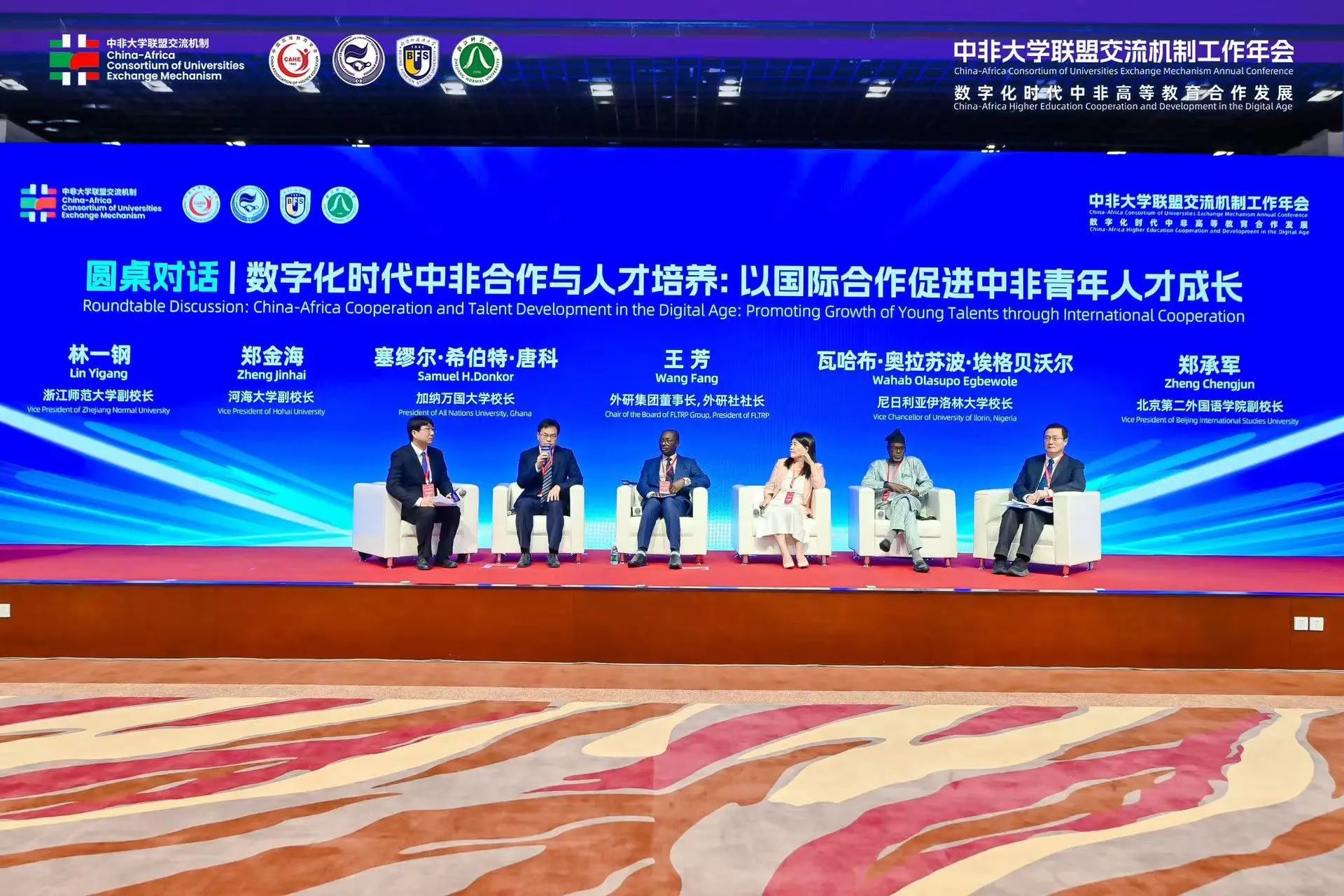 对外经济贸易大学校长赵忠秀、华北水利水电大学校长刘俊国作主旨发言,河海大学副校长郑金海、加纳万国大学校长塞缪尔•希伯特•唐科,外研集团董事长王芳,尼日利亚伊洛林大学校长瓦哈布•奥拉苏波•埃格洛贝沃尔做圆桌对话。