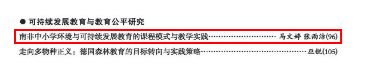 近日,浙江师范大学教育学院青年教师马文婷和博士研究生张雨洁在CSSCI来源期刊《比较教育研究》2024年第9期发表学术论文《南非中小学环境与可持续发展教育的课程模式与教学实践》。文章指出,全球面临日益严重的环境问题与生态风险,要求世界各国重新构想人类发展,并支持缓解生态压力的社会变革。南非自1994年种族隔离制度终结进入后种族隔离时代以来,就一直在探索能够促进生态可持续发展的方案。在教育领域,南非逐渐形成并不断完善环境与可持续发展教育。环境与可持续发展教育不仅是教育改革的关键,也是南非可持续发展战略的重要组成。该文通过研究南非中小学环境与可持续发展教育的课程模式与教学实践,为理解南非在环境教育方面的努力提供新知识。
