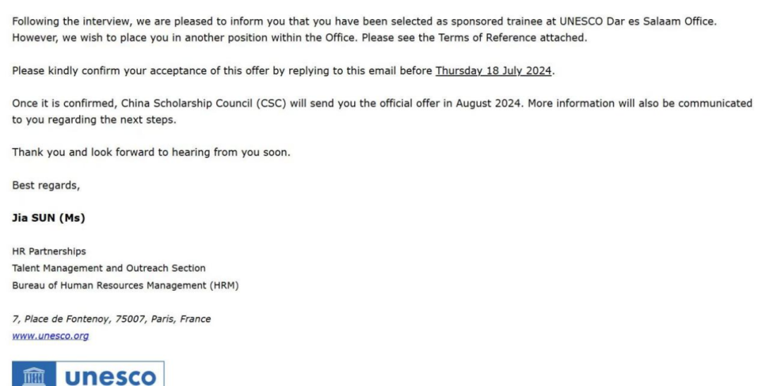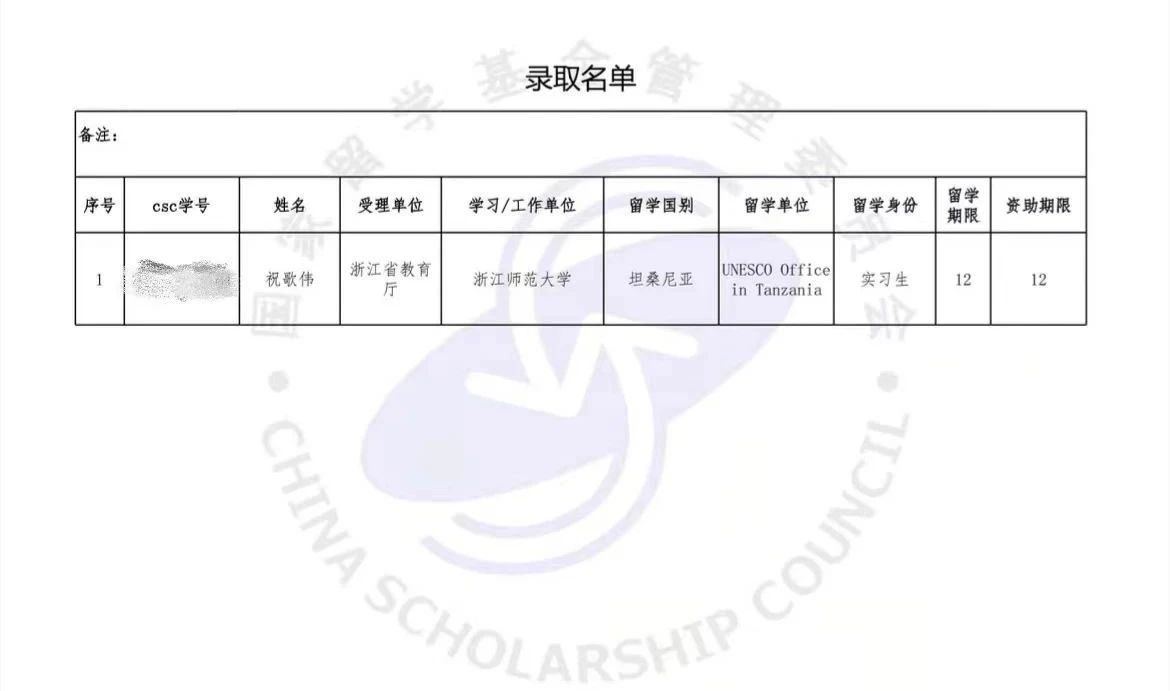 2024年8月,祝歌伟收到了国家留学基金委2024年国际组织实习项目(与联合国教科文组织合作项目)的贺信,刚刚研究生毕业的他,即将以教科文组织驻坦桑尼亚代表(总干事)行政助理的身份,在10月份重返非洲大地。