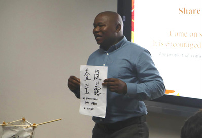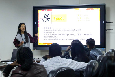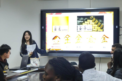 活动伊始,主持人以“秋”字为核心,通过字谜竞猜游戏活跃现场的气氛,随后,通过双语讲解汉字的演变过程,引导大家深入了解汉字的组词和发音,随着对“秋”“金”“果”等汉字的讲解,大家进一步探讨了与秋天相关的成语和典故,也让参与者感受到了“秋天”背后汉字的深厚文化底蕴。