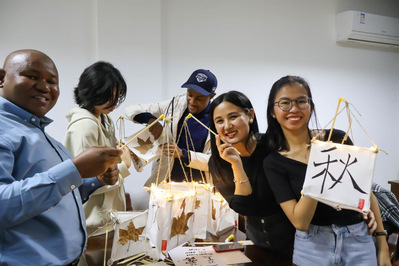 秋灯在中国有“寄托幸福、留住丰收喜悦”的寓意,搭框架、贴秋叶、盖红印、糊灯纸,制作秋灯的步骤也充满了中华传统手工的古典韵味。在中国学生的指导下,留学生制作秋灯的技法愈发娴熟。当所有的秋灯被点亮,大家彼此欣赏各自的作品,不仅沉浸在成功制作秋灯的喜悦之中,更借由制作秋灯,更加深刻的理解了中国的“秋”文化。