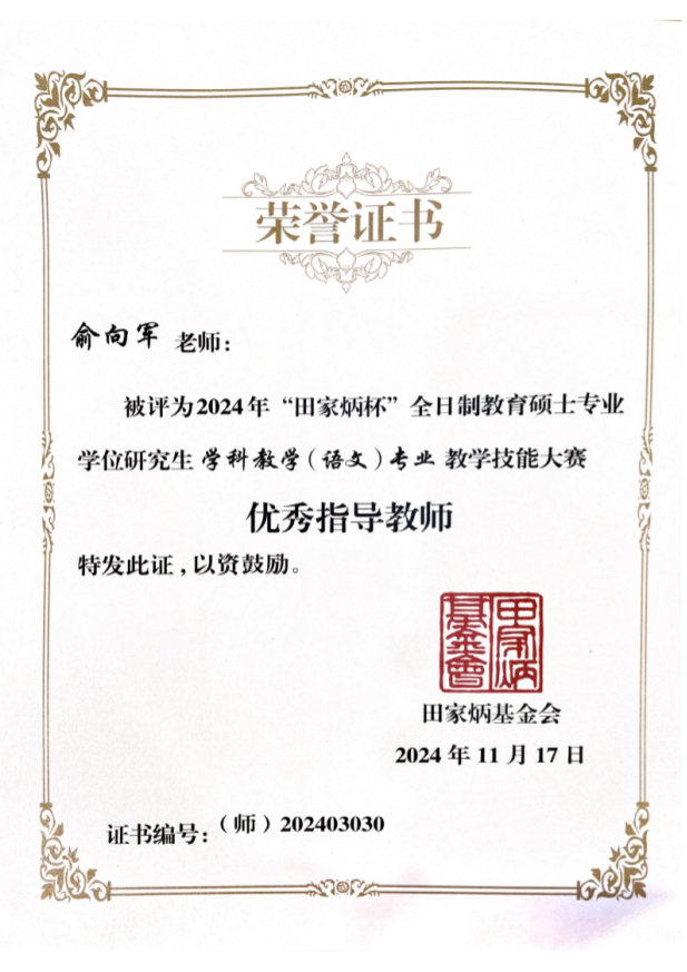 11月15-17日,2024年全国“田家炳杯”全日制教育硕士专业学位研究生学科教学(语文)专业教学技能大赛决赛在江苏师范大学举办,我院两名学生入围决赛,任睿老师带队参与,通过激烈的竞争,李梦琪获得二等奖,孔忆雯获得三等奖,俞向军老师获得优秀指导教师奖。