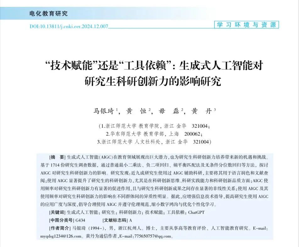近日,浙江师范大学教育学院青年教师马银琦及其团队在一级期刊《电化教育研究》2024年第12期发表《“技术赋能”还是“工具依赖”:生成式人工智能对研究生科研创新力的影响研究》。在智慧信息技术迅猛发展的时代,生成式人工智能(AIGC)正逐渐渗透到各个领域,从商业广告到医疗诊断,再到学术研究,AIGC的应用日益广泛,特别是在教育和科研领域,AIGC展现出了极大的潜力,研究生作为科研创新的生力军,其科研创新力的培养对整个科学技术的发展和社会进步至关重要。在此背景下,文章基于1714份研究生调查数据,采用普通最小二乘法,负二项回归,熵平衡匹配法及无条件分位数回归等方法,探讨AIGC对研究生科研创新力的影响,为研究生科研创新力的培养提供实证依据,从而推动AIGC技术在高等教育领域中的优化应用。