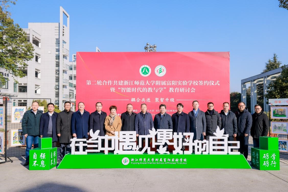 12月29日上午,浙江师范大学附属富阳实验学校第二轮合作共建签约仪式暨“智能时代的教与学”教育研讨会在该校隆重举行。中国教育学会常务副会长、《中国基础教育》总编辑翟博,中国教育学会副会长、浙江省教育学会会长、浙江省教育厅原副厅长韩平,浙江师范大学副校长兼教育学院院长林一钢,杭州市教育局副局长蒋锋、富阳区副区长詹艳青,学校继教处、教育学院相关负责人等出席。开幕式由富阳区教育局局长费国民主持。