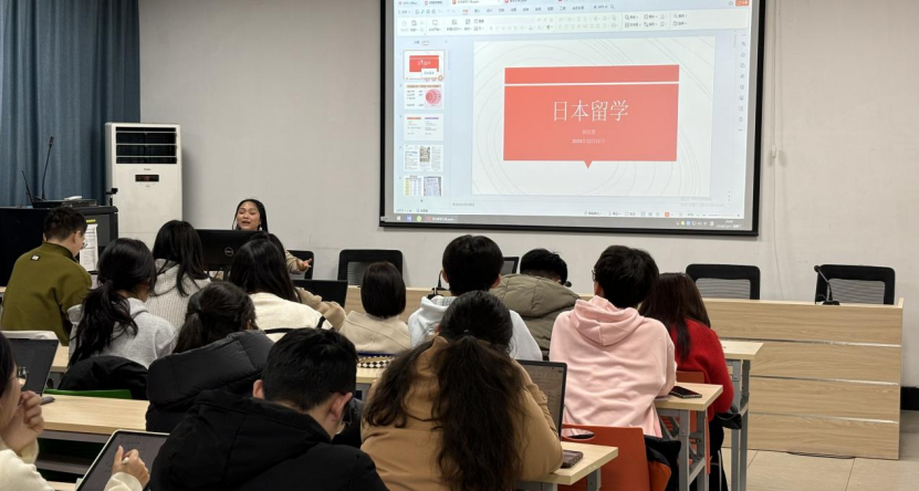 紧接着,由胡启慧老师带来了日本留学经验谈。她首先向同学们介绍了日本公立和私立大学高等教育体系的情况。随后,在申请流程方面,她详细说明了申请硕士的两种途径,以及准备研究计划书、语言证书,联系导师的具体事宜。她以自身的经历激励同学们勇敢地追求留学日本的梦想,预祝大家顺利申请到日本心仪的硕士项目。