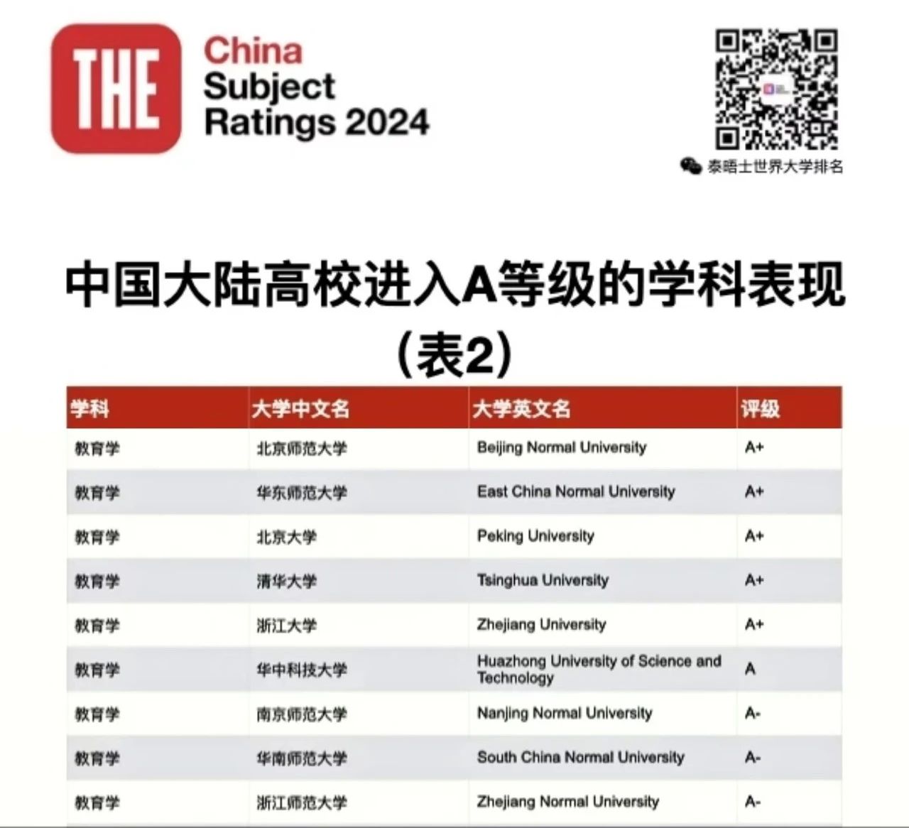 教育学学科在泰晤士高等教育中国学科评级中荣获A-等级。