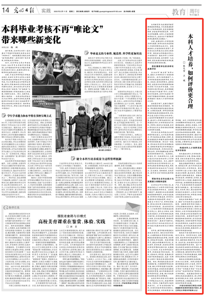 当前,我国本科人才评价呈现多样化趋势,但学位论文仍是考核人才培养质量的主流方式。在鼓励创新人才培养的时代背景下,学位论文是本科能力认证的必要条件吗?高校该如何构建差异化人才培养标准?高校本科人才评价综合体系的功能、效用谓何?凡此种种,皆是我国本科教育改革发展中需要直面的重要议题。