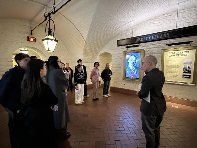 2月3日,在Melinda教授的带领下,我们踏入了俄亥俄州的政治与历史中心——Ohio Statehouse(俄亥俄州议会大厦)。这座始建于1839年的古典建筑,庄严肃穆,见证了城市百余年的变革,是俄亥俄州政治与历史的象征。高耸的石柱、庄严的大厅,无声地诉说着这片土地上百年来的民主进程,也让我们对民主、治理与公民教育有了更深刻的思考。