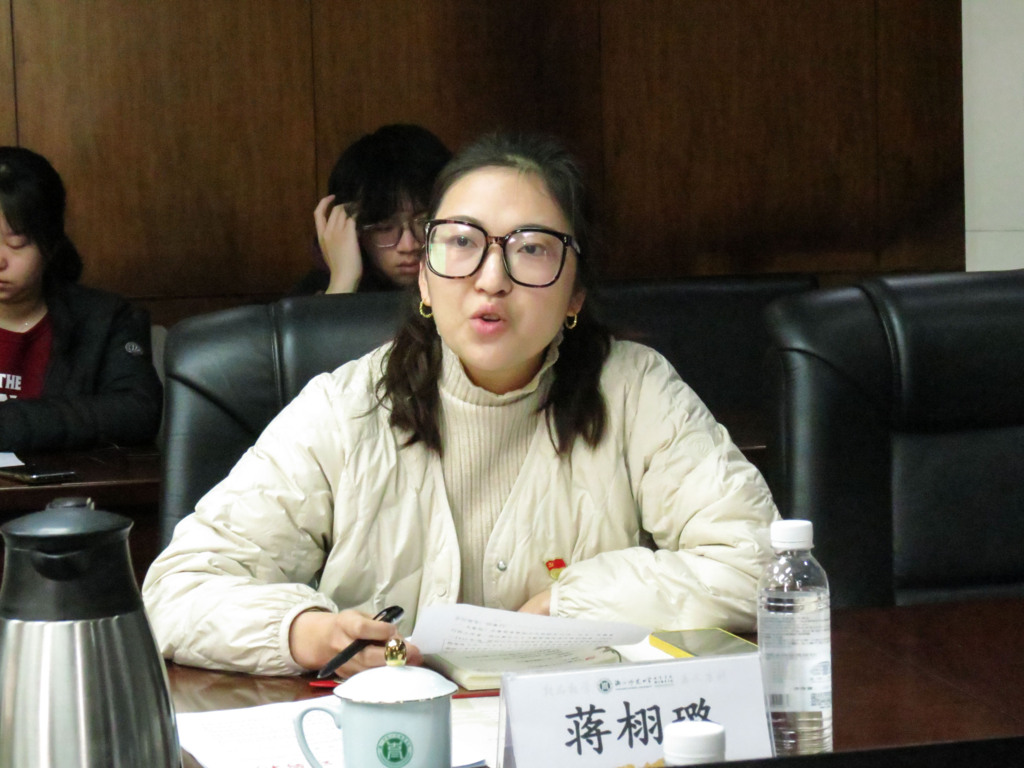蒋栩璐发言时谈到,数字化是实现现代化目标的重要抓手。结合学院行政办公、资源配置情况,她介绍了数字技术为学院行政工作带来的便利性,并表示行政人员需要持续提升数字化素养,提高信息化能力,为加快建设教育强国贡献力量。