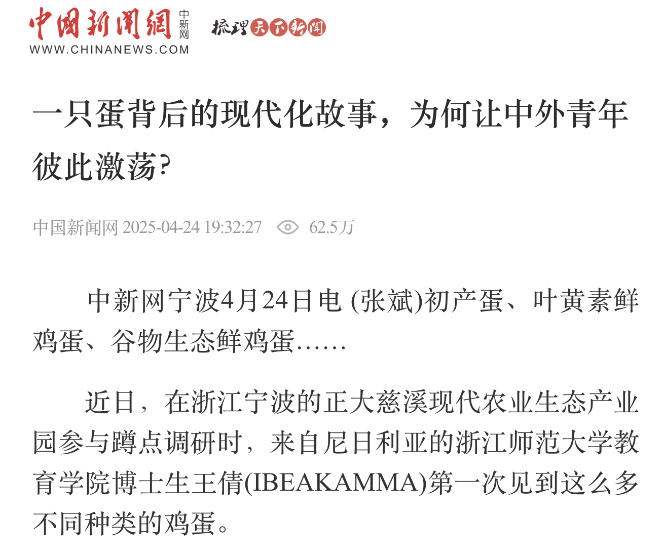 在浙江宁波的正大慈溪现代农业生态产业园参与蹲点调研时,来自尼日利亚的浙江师范大学教育学院博士生王倩(IBEAKAMMA)第一次见到这么多不同种类的鸡蛋。