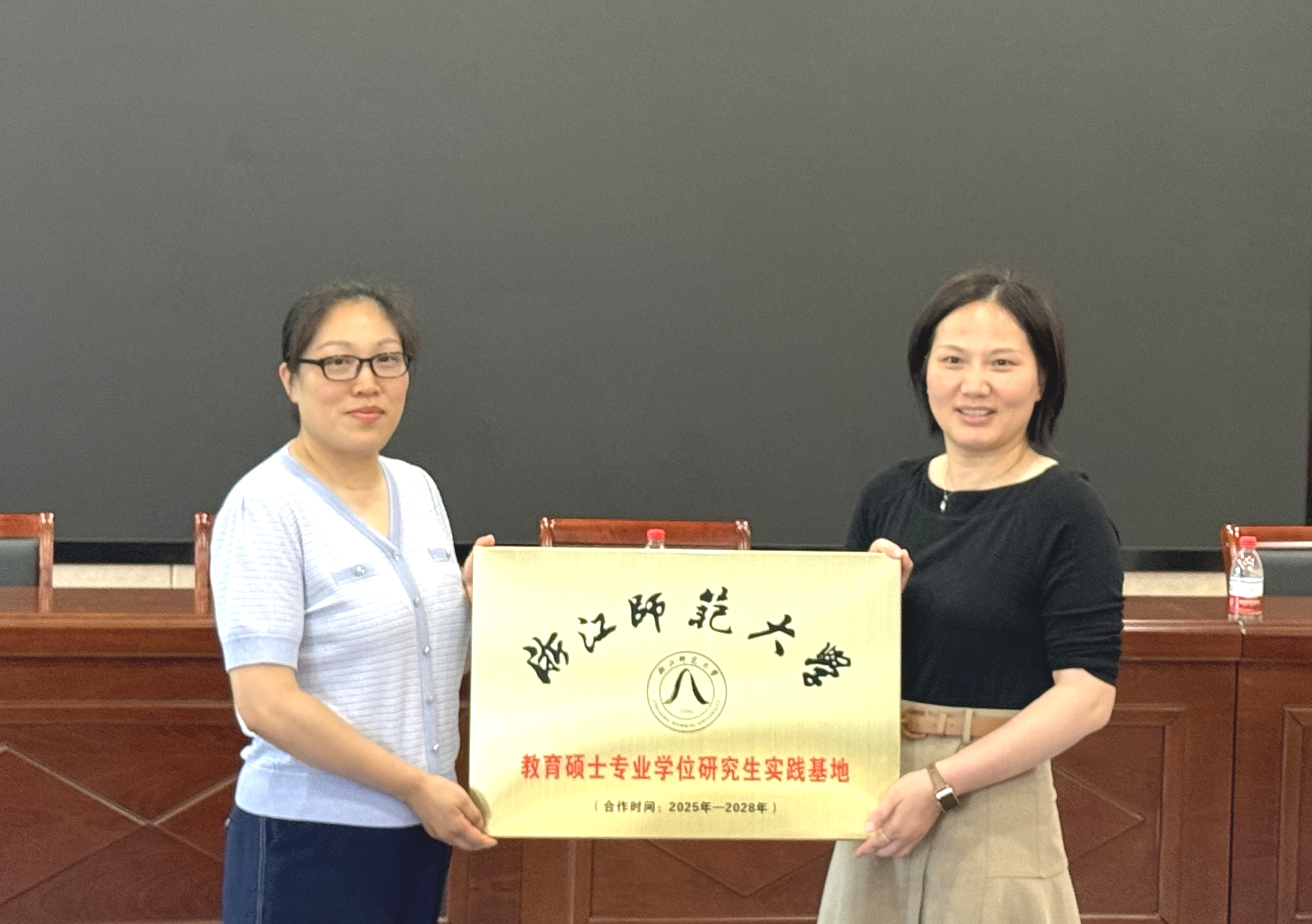 向道红为婺外颁授“浙江师范大学教育硕士专业学位研究生实践基地”铜牌,并回顾了两校长期合作的深厚基础,她希望未来两校在基础教育与高等教育融合方面探索更深层次合作。她指出,教育硕士培养需注重“见习—实习—研习”的有机衔接,鼓励实习生以优秀教师为榜样,提升教学能力。