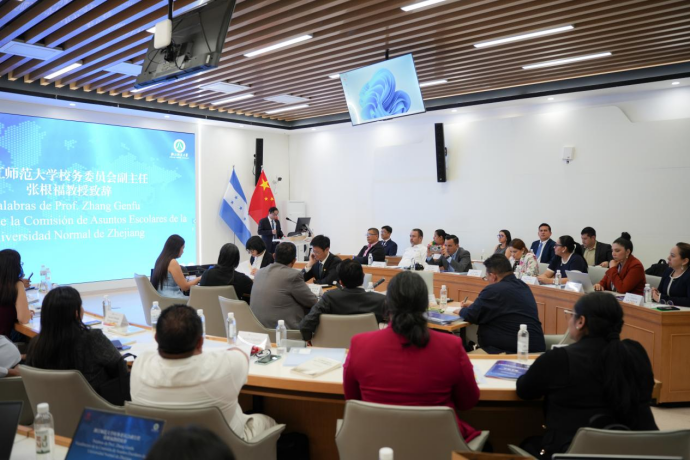 张根福对来自洪都拉斯的教育管理学员表示热烈欢迎,并详细介绍了浙江师范大学的历史沿革、学科建设、师资力量以及学校在教育援外发展领域取得的一系列卓越成就。他强调,教育交流与合作是推动文明进步和大学发展的重要途径,是连接不同文化、促进共同繁荣的重要桥梁。他期望所有参与者能充分利用这次研修的机会,积极交流分享经验,深度挖掘中国与洪都拉斯在教育领域的互补潜力,携手推进教育治理体系的现代化转型,提升治理效能,共同谱写教育事业蓬勃发展的时代华章。