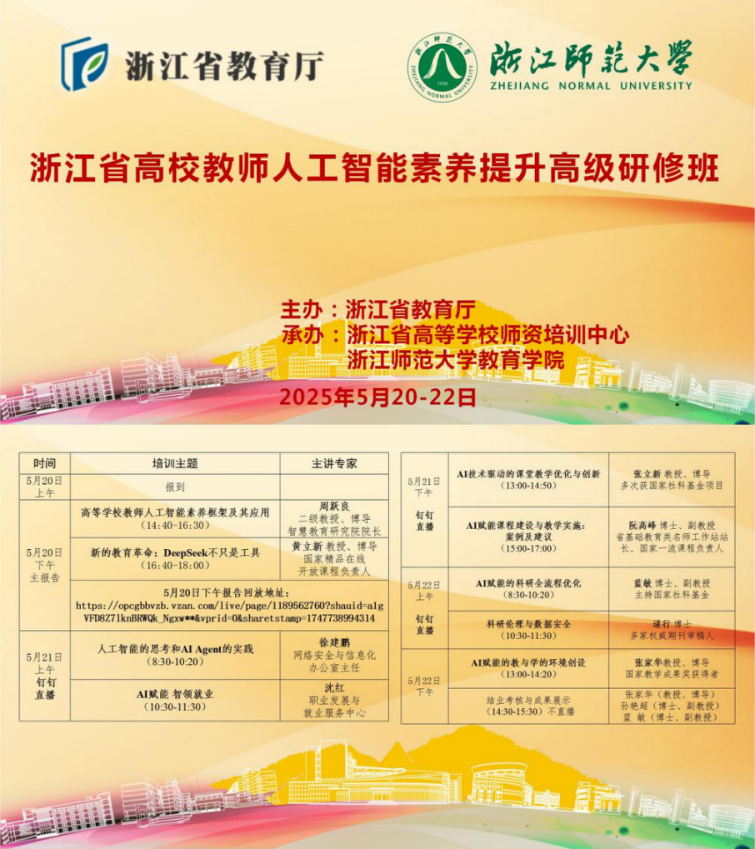 5月20日至22日,浙江省大中小学教师人工智能素养提升高级研修班成功举办。本次研修采取杭州、金华双会场模式,杭州会场聚焦中小学教师群体,金华会场面向高校教师群体,通过“现场+云端”双线联动,覆盖全省教师队伍,实现跨地域、跨学段资源融通,构建人工智能教育新生态。