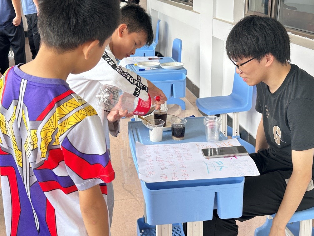 趣探未知板块包括当可乐遇上盐、神笔马良、彩虹桥等七个项目。一系列创新互动、趣味十足的科学小实验,为孩子们揭开了科学的神秘面纱。“当可乐遇上盐”瞬间喷发的现象,让孩子们直观感受到化学反应的魔力;小朋友们变身“神笔马良”,用神奇的笔在水中画出漂浮的奇妙图案;又看着色彩在纸巾上慢慢“爬”出一道美丽的“彩虹桥”。面对这些令人惊叹的现象,孩子们不时发出“哇”的惊呼。在这轻松愉快的探索氛围里,孩子们不仅收获了游戏的快乐,更在亲身实践中理解了科学原理,点燃了求知欲的火花。