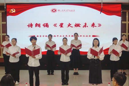 优秀毕业生党员代表赵辉发出了题为《弘扬教育家精神,争做新时代育人“大先生”》的倡议,呼吁毕业生党员坚守教育初心,提升育人能力,争做新时代育人“大先生”。随后,党员代表带来诗朗诵《星火燃未来》,诠释青春使命,展现出新时代青年踔厉奋发、勇毅前行的昂扬风貌。