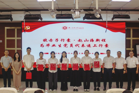 学院领导为毕业生党员代表递上“毕业行囊”,这份特殊的礼物承载着党组织与母校的期望与嘱托。学院党委领导班子成员为全体毕业生党员送上毕业祝福,激励他们勇担使命。在王丽华老师的带领下,师生党员重温入党誓词,切实体悟到党员身份的神圣与责任。