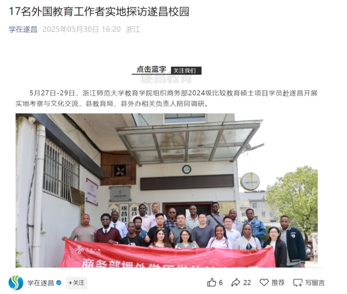 5月27日至29日,浙江师范大学商务部援外学历学位教育(比较教育学硕士)项目2023级留学生走进浙江丽水遂昌,开启为期三天的社会实践与文化体验之旅。活动融合教育交流、历史探寻与生态实践,立体展现浙西南小城的人文底蕴与发展活力,受到遂昌新闻、遂昌统战、学在遂昌等官方媒体账号的关注与报道。