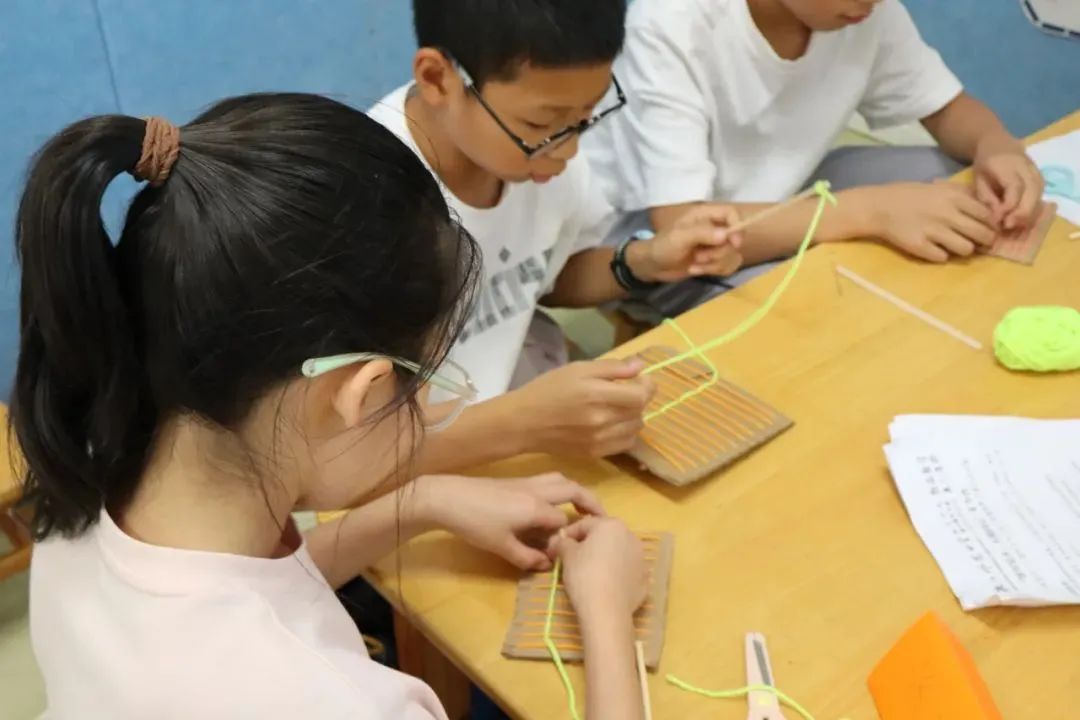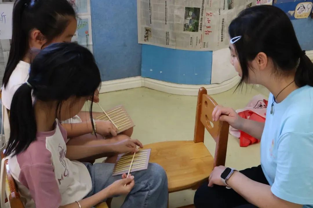 实践队队员们拿出穿好线的硬纸板,指导孩子们用不同颜色的毛线模拟织布的全过程。音乐响起,孩子们挥动亲手制作的彩带旋转。这不仅是一堂课程,更是畲族先人们借着刺绣技艺的灵动,与今日的孩童诉说着千年前的智慧与祝福。