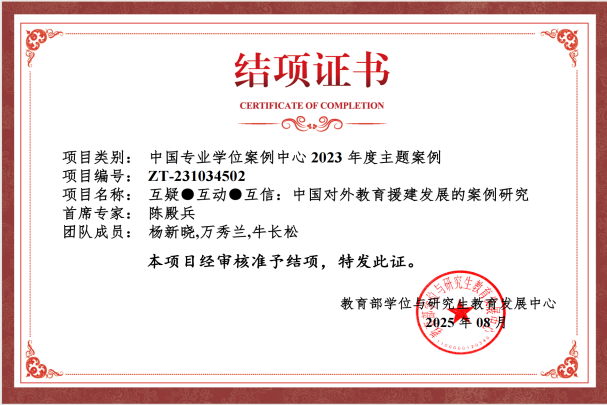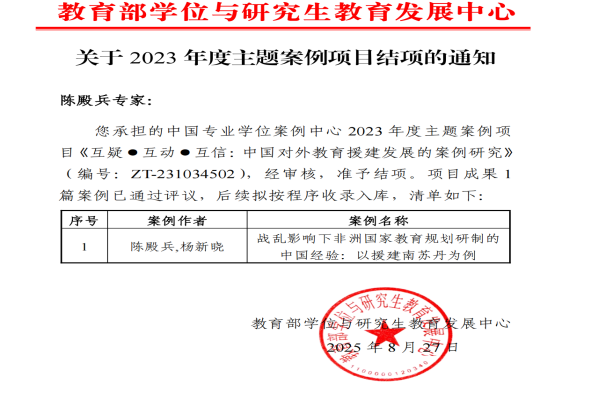 近日,教育部学位与研究生教育发展中心公布了2023年主题案例项目结项通知,教育学院(教师教育学院)陈殿兵老师主持的,杨新晓、万秀兰和牛长松老师参与的《互疑·互动·互信:中国对外教育援建发展的案例研究》顺利结项,案例《战乱影响下非洲国家教育规划研制的中国经验:以援建南苏丹为例》通过专家评议,后续按程序收录入库。
