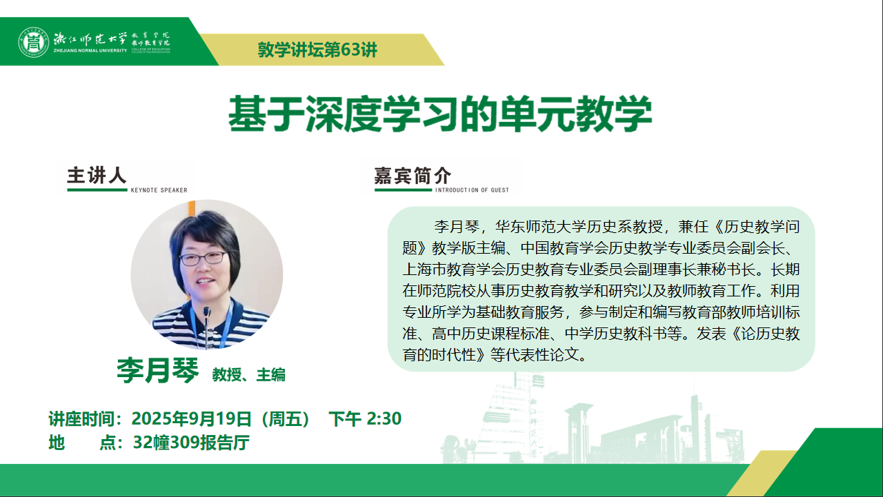 2025年9月19日(周五)下午2:30,华东师范大学历史系教授、《历史教学问题》教学版主编李月琴将于32幢309报告厅主讲《敦学讲坛第63讲:基于深度学习的单元教学》,欢迎感兴趣的师生参加!