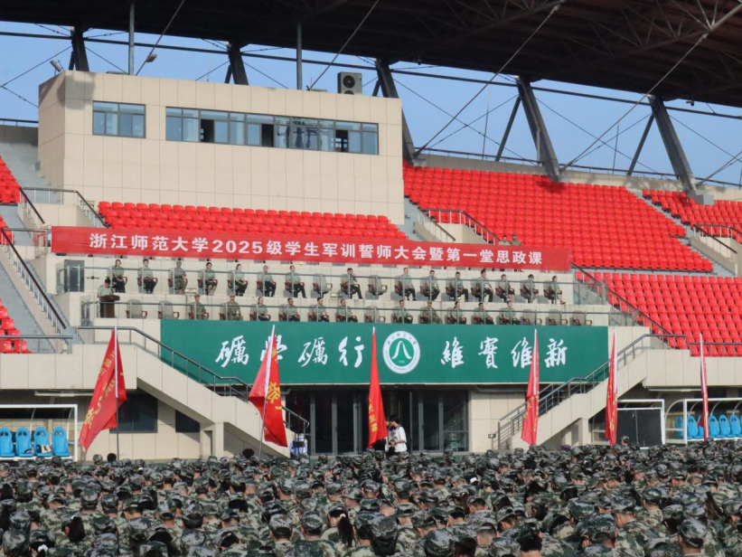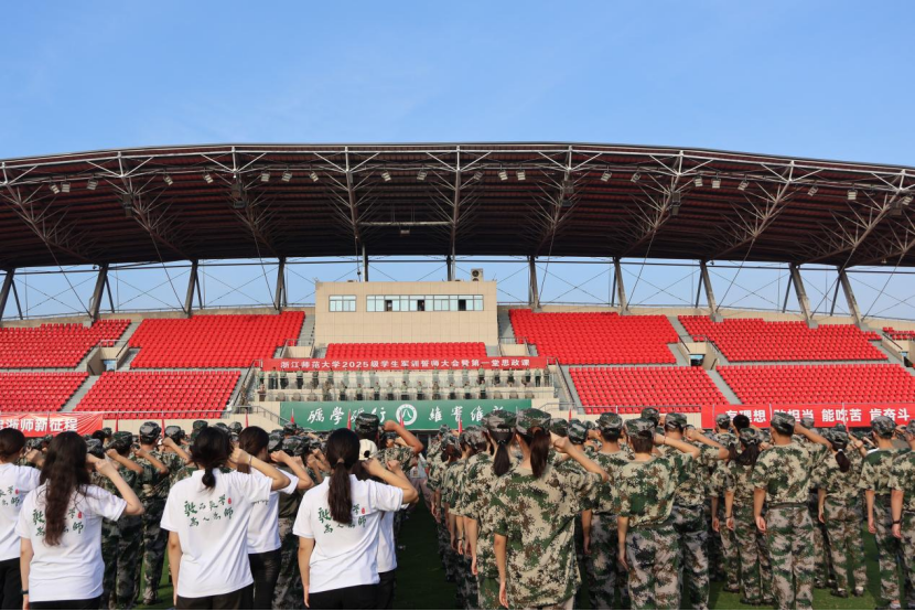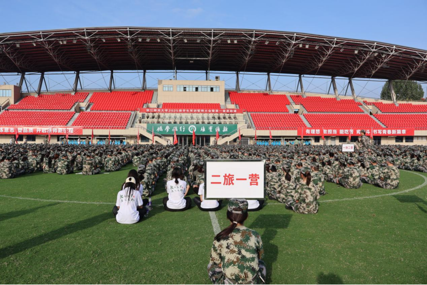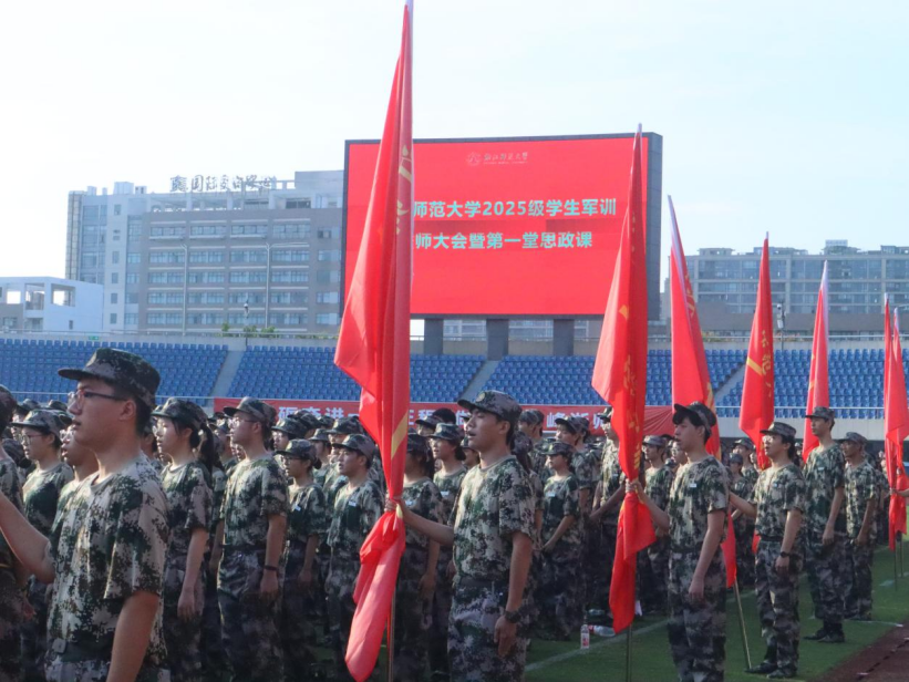 9月18日上午,我校2025级学生军训誓师大会暨第一堂思政课于东田径场隆重举行。教育学院(教师教育学院)新生统一身着迷彩戎装,阵容严整、精神抖擞,展现出昂扬的军训气象。校党委书记、军训工作领导小组组长蒋云良,校长、军训工作领导小组组长邱利民,校党委副书记、军训工作领导小组副组长吕迎春,副校长、军训工作领导小组副组长李盛,中国人民解放军某部队副政委、军训师师长康泰,中国人民解放军某部队副参谋长李志强等出席誓师大会。蒋云良以“九一八事变”为历史切入点,为全体参训学生讲授题为《磨砺维实之志,争做时代之锋》的军训思政第一课。他强调,同学们应以“红色根脉”铸魂励志,传承爱国情怀与强国使命;以“榜样星河”照亮前行之路,做到砺学砺行、知行合一;以“智能浪潮”赋能未来发展,积极运用AI技术的同时坚守教育初心与社会责任,努力成为真正挺膺担当的时代奋斗者。