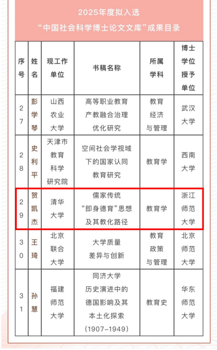 近日,中国社会科学出版社公布了2025年度“中国社会科学博士论文文库”入选名单。浙江师范大学教育学院(教师教育学院)博士毕业生贺凯杰的学位论文《儒家传统“即身德育”思想及其教化路径》成功入库,其指导老师为冯昊青教授。