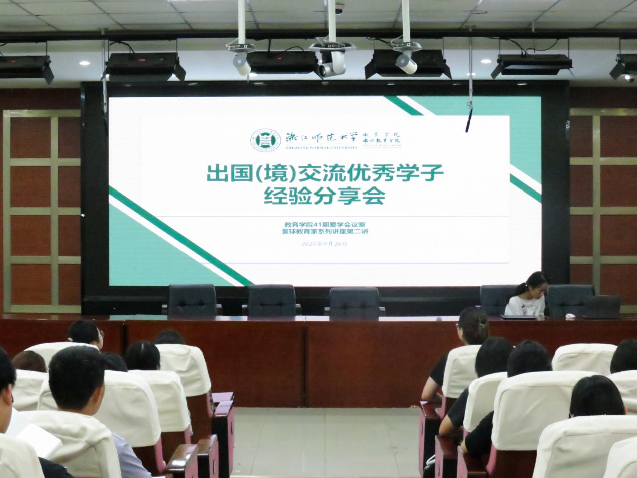 为拓宽学生全球学术视野,助力新生科学规划发展路径,9月26日,教育学院(教师教育学院)举办了第41期“爱学会议室”暨“寰球教育家”系列讲座第二讲——出国(境)优秀学子经验分享会。活动邀请了多位具有海外学习经历的学生进行交流,包括课程与教学论2023级硕士研究生吴倩,课程与教学论2024级硕士研究生王思璇,小学教育2023级本科生梁祺乐、王子绚、曹嘉璐、钱舒畅,教育技术学2023级本科生陈轩雅,小学教育2024级本科生乌英秀,以及教育技术学2024级本科生杨旭轩。全体2025级新生参加了本次分享会。