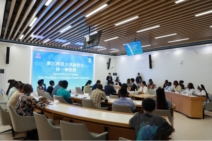 9月29日上午,由商务部主办、浙江师范大学承办的2025级援外学历学位教育项目——浙江师范大学比较教育硕士项目开班仪式,在浙江师范大学教师教育实训中心一楼会议室顺利举行。浙江师范大学副校长兼教育学院(教师教育学院)院长林一钢出席并致辞。教育学院(教师教育学院)党委书记苏煜,国际交流合作处副处长沈立煌,教育学院(教师教育学院)党委副书记王晓均、副院长王占军、国际化办公室主任陈殿兵、教授万秀兰、留学生硕士点负责人徐倩、国际学生辅导员刘颖、国际化办公室秘书陈佳缘等一同出席。来自亚非12个国家的24名比较教育硕士项目学员参加仪式。仪式由苏煜主持。