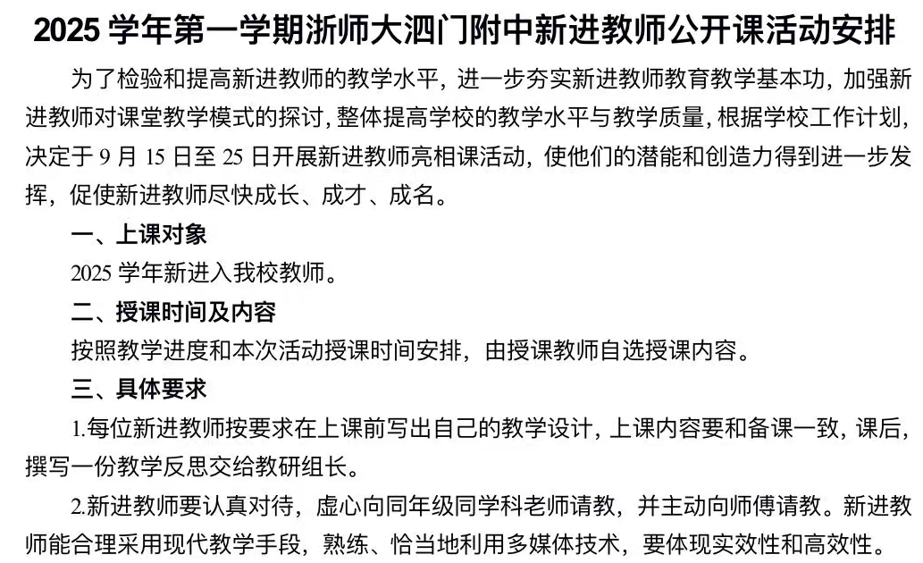 为检验和提高新进教师的教学水平,进一步夯实其教育教学基本功,深化新进教师对课堂教学模式的探索,全面提升学校教学水平与质量,特级教师赵寅芬与外派联系专家陈伟强共同策划,于浙师大附属泗门实验中学开展了为期十天(9月15日至25日)的新进教师亮相课活动,助力新教师快速成长、成才、成名。