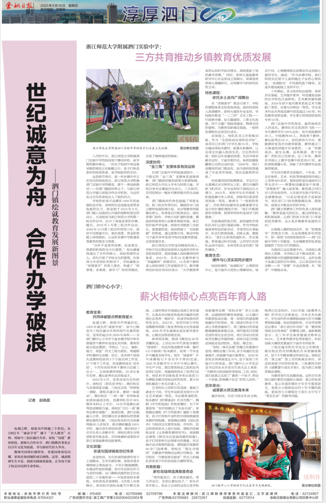 9月18日,浙师大附属泗门实验中学“三方共育推动乡镇教育优质发展”实践成果获《余姚日报》专题报道。该报道展现了校地协同育人的创新成效,彰显了浙江师范大学在服务浙江省基础教育改革、助力教育共富与乡镇教育质量提升方面的示范作用。
