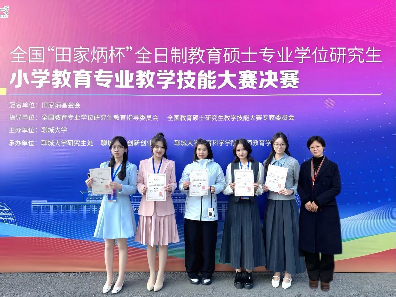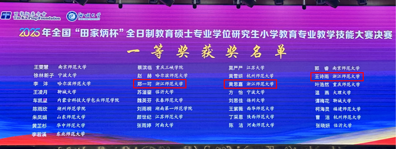 日前,2025年全国“田家炳杯”全日制教育硕士专业学位研究生小学教育专业教学技能大赛决赛在聊城大学落幕。我院五名研究生在决赛中表现出色,全员获奖,取得一等奖3项、三等奖2项的优异成绩。本届大赛共有来自全国115所高校的553名选手参加初赛,104所高校的278名选手入围决赛,最终产生一等奖33名、二等奖55名、三等奖110名,以及教学设计优秀奖76名。我院研究生郑一可、黄思嘉、王诗雨荣获一等奖,王晶晶、秦佳玮荣获三等奖。郎建胜教授、钱旭升教授、江淑玲副教授获评优秀指导教师。