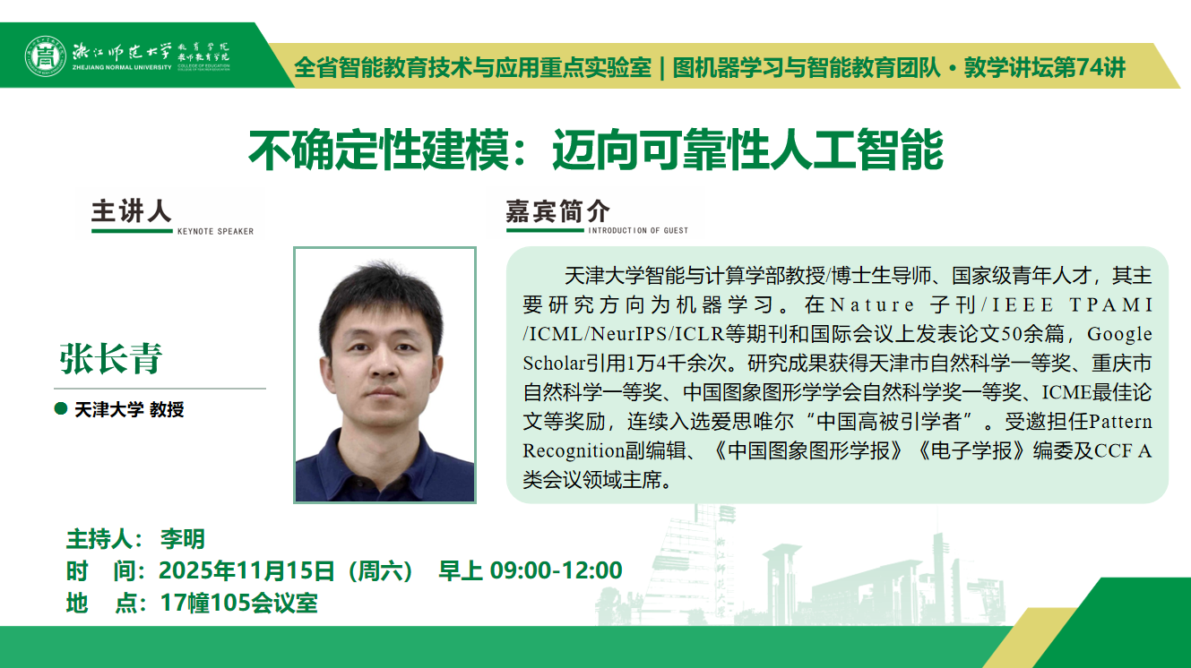 天津大学智能与计算学部教授、博士生导师、国家级青年人才张长青教授,将主讲敦学讲坛第74讲《不确定性建模:迈向可靠性人工智能》。