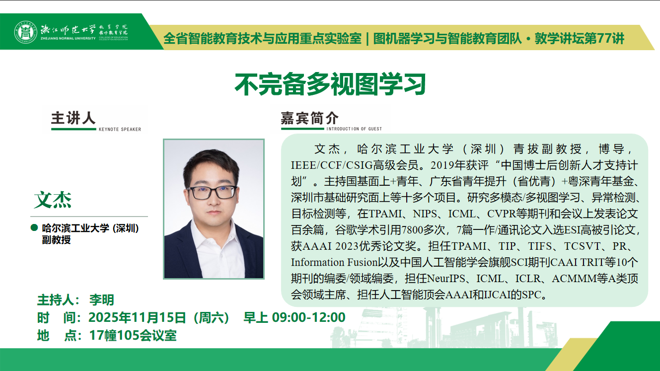 哈尔滨工业大学(深圳)青拔副教授、博导、IEEE/CCF/CSIG高级会员文杰教授,将主讲敦学讲坛第77讲《不完备多视图学习》。