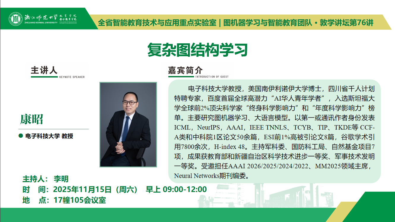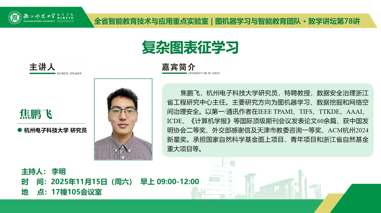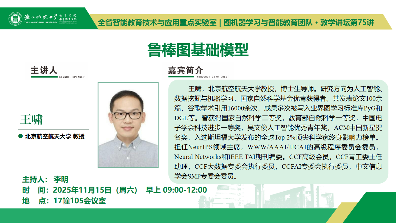2025年11月15日(周六)上午9:00-12:00,教育学院敦学讲坛第74-78讲暨全省智能教育技术与应用重点实验室、图机器学习与智能教育团队系列讲座将于17幢105会议室举行。