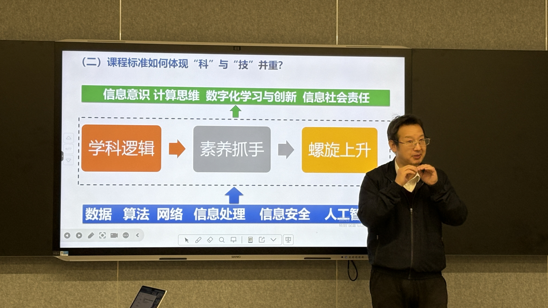 在会议中,李锋着重强调了信息安全教育的重要性。他指出,当前各类电子设备普遍存在监听和监控风险,必须引导学生增强隐私保护意识,确保使用通过国家安全认证的平台进行学习。李锋进一步阐释,当前社会正经历从“互联网+”向“大数据+”的时代转型。高中阶段的信息科技教育必须紧跟时代发展,此次课程标准修订中,必修模块按照“数据—算法—互联网—人工智能”的递进逻辑进行设计,并注重不同学段之间的有效衔接,这将帮助学生建立更完整的学科认知体系。此外,李锋特别提到,参与本次课程标准制定的专家团队为此付出了卓有成效的努力。