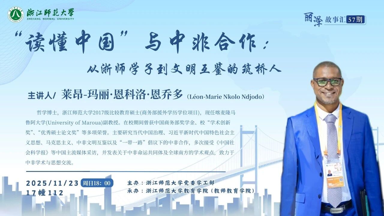 “与汉学结伴,和中国同行。”国家主席习近平在复信青年汉学家时的深情寄语,正如一座跨越山海的文明之桥,激发起越来越多人对中外文明对话的向往与责任。在此背景下,第57期“丽泽故事汇”特邀中非文明交流的代表——浙江师范大学教育学院(教师教育学院)2017级比较教育学硕士毕业生、现任喀麦隆马鲁阿大学哲学副教授的莱昂-玛丽·恩科洛·恩乔多(Léon-Marie Nkolo Ndjodo),重返母校,讲述他从浙师学子成长为文明互鉴“筑桥人”的动人历程。